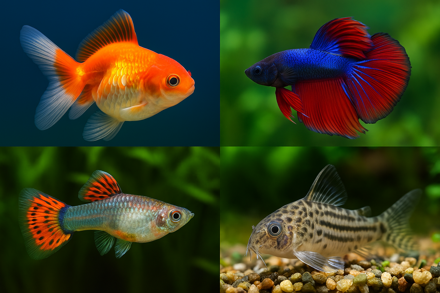 구피는 작고 색상이 화려하며 번식력이 뛰어난 물고기입니다. 초보자에게도 적합한 물고기로, 여러 마리를 함께 키우면 수조가 더 생동감 있게 느껴집니다.
